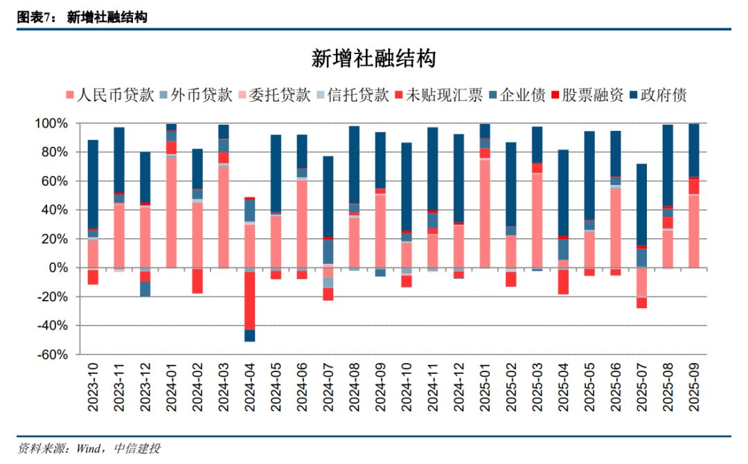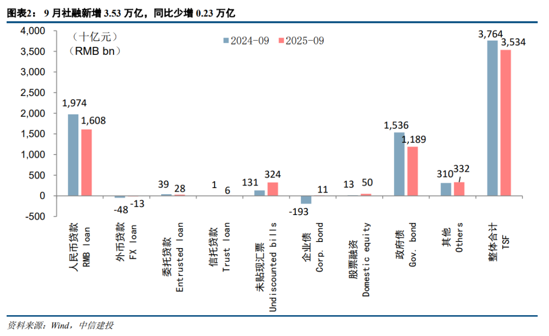 高基数下政府债支撑力度有所减弱,但仍将是全年社融增长的重要动能:(1)9月政府债新增1.19万亿,同比少增3471亿元。9月地方债新增9149亿元,同比少增1785亿元;专项债新增6658亿元,同比少增1823亿元。在今年积极的财政政策导向下,国债和政府专项债发行进度较快,以支持“两重”“两新”、置换地方政府隐性债务等,有力支撑了社融增量,9月政府债对社融支撑力度有所减弱,但主要是受去年同期高基数影响,展望后续,财政赤字率提高至4%的情况下,预计全年能新增政府债近12万亿元,财政部明确表示:“未来财政政策发力空间依然充足。”目前部分2026年新增地方政府债务限额已经提前下达,预计财政支持力度仍将保持强劲,政府债仍将是2025年社融增长的重要动能。(2)9月表外融资增长3579亿元,同比多增1869亿元,其中委托贷款增长282亿元,同比少增110亿元,信托贷款增长62亿元,同比多增56亿元,未贴现汇票增加3235亿元,同比多增1923亿元。(3)9月直接融资规模新增605亿元,同比多增2403亿元,其中企业债新增105亿元,同比多增2031亿元。股票融资新增500亿元,同比多增372亿元。