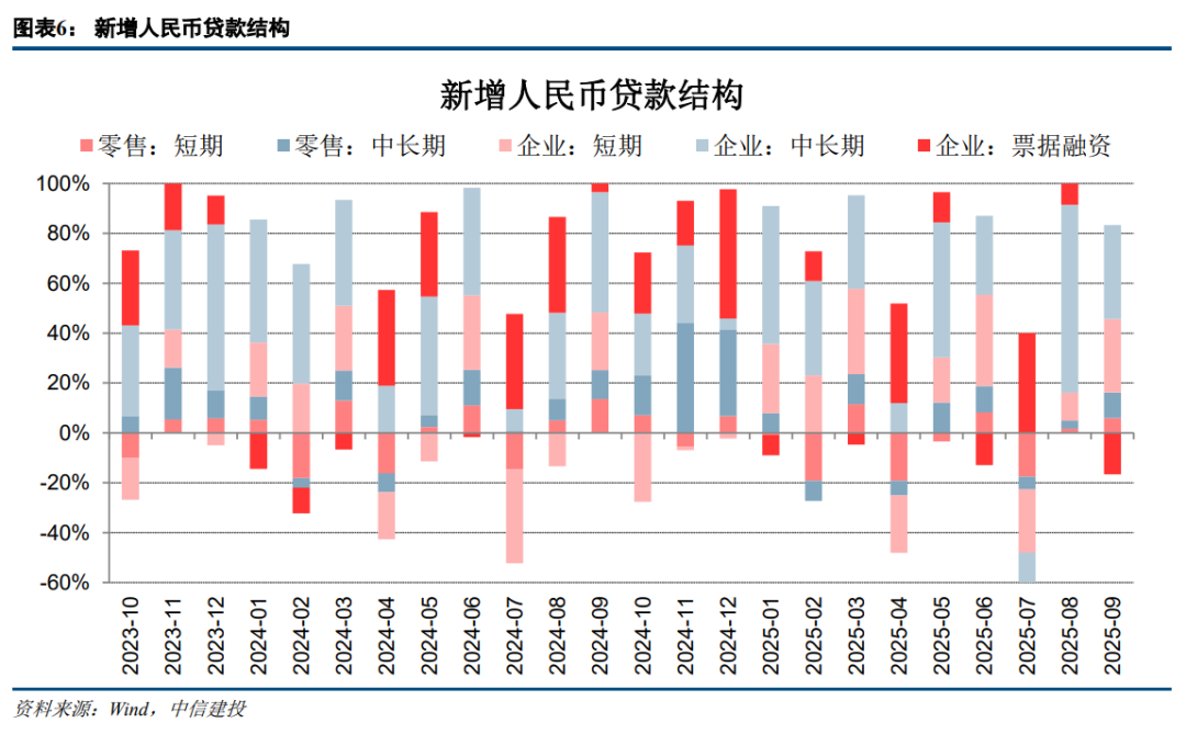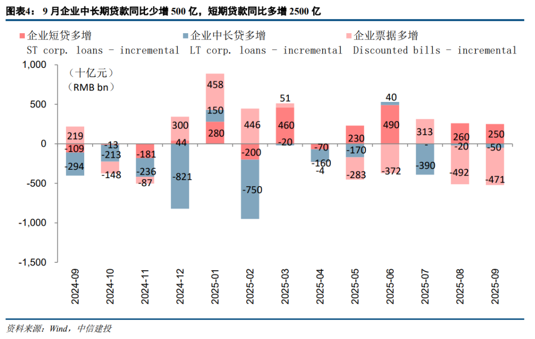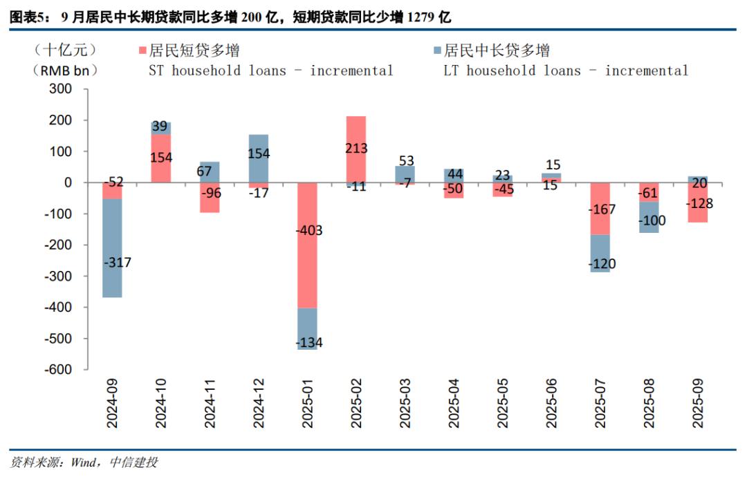 9月企业短期融资需求边际改善,中长贷主要受化债拖累。票据冲量显著降低,对公信贷结构明显优化。9月企业短贷新增7100亿元,同比多增2500亿元,企业中长期贷款新增9100亿元,同比少增500亿元。票据融资减少4026亿元,同比多减4712亿元。中长贷同比小幅少增,主要是化债不断推进下专项债置换存量贷款导致。票据冲量显著降低,侧面反映出信贷增量有所减少,但银行支持实体经济力度不减,对公信贷结构明显优化。企业短贷明显多增,侧面反映出实体企业融资需求边际改善。随着“反内卷”、改善民营经济发展环境等政策的不断出台落地,企业经营环境在明显改善。随着积极财政政策“自上而下”+促消费、拉动内需政策“自下而上”共同驱动,产业链中下游企业的经营动能和企业家信心应有望改善,带动信贷需求逐步回暖。预计2025年对公信贷增量至少能保持相对稳定。