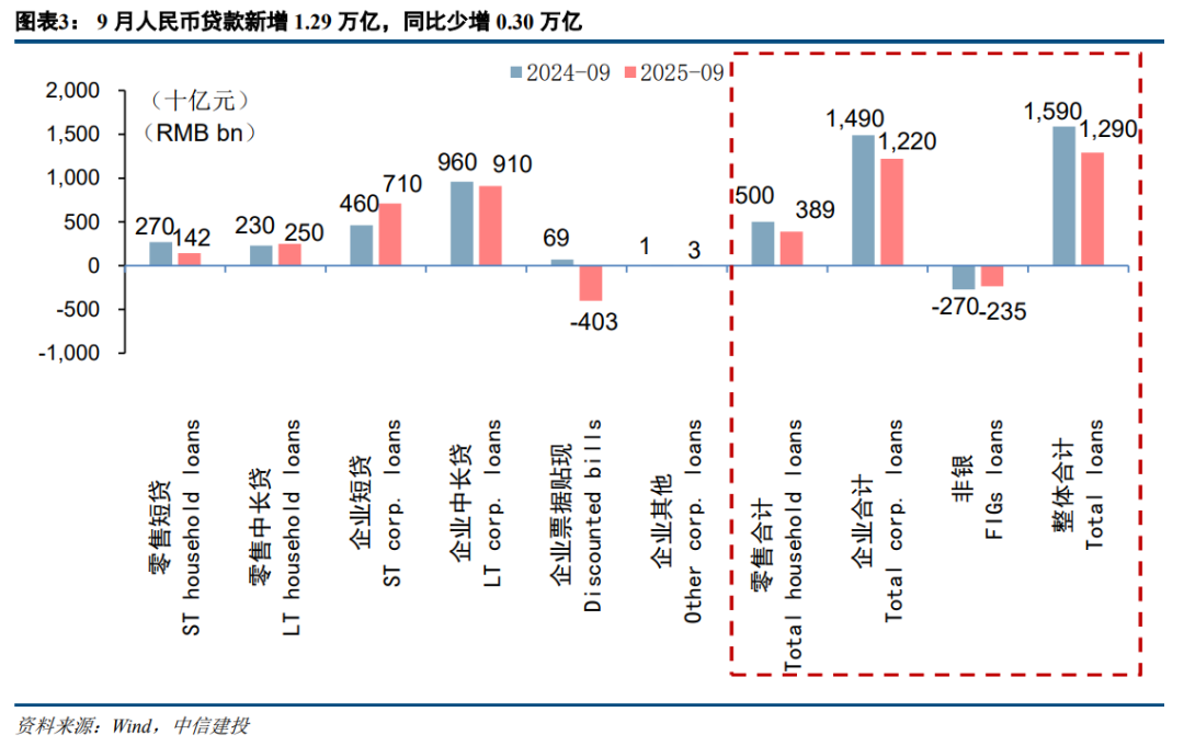 2、三季度信贷投放偏弱,对公、零售信贷均持续同比少增。9月信贷新增1.29万亿,同比少增3000亿元。其中,对公信贷新增1.22万亿,同比少增2712亿元,零售信贷新增3921亿元,同比少增1079亿元。由于今年信贷投放节奏靠前,上半年信贷冲量明显,三季度信贷投放偏弱,对公、零售两端信贷均同比少增。
