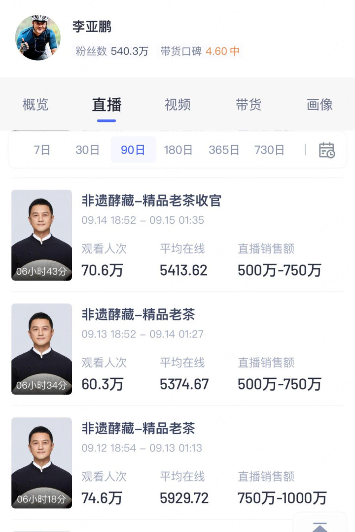 李亚鹏近年来一直在个人账号直播售卖茶叶,其账号视频报价为54000元-81000元,账号九月直播13场,平台数据显示直播销售总额超过3600万。