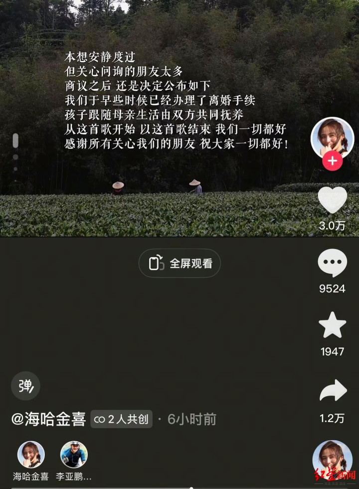 早在今年5月份就有两人离婚的传言出现,当时海哈金喜曾发视频回应此事,称“确实很久没在一起了”,并解释原因是“春节后李亚鹏开始‘上山下乡’为大家寻找优质茶叶,而自己从2024年底成立个人工作室后,需要处理很多杂事,才导致两人长期不在一起”,但当时强调“不是出什么问题或是离婚”。